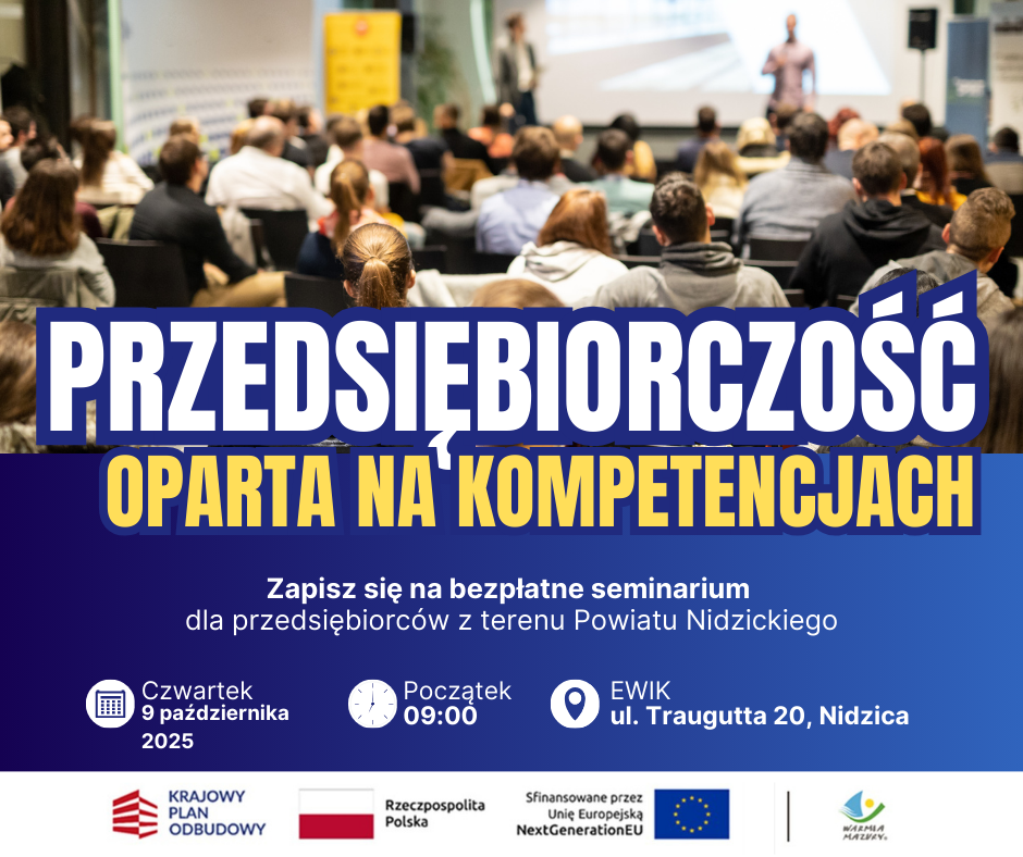 Marszałek Województwa Warmińsko-Mazurskiego Marcin Kuchciński, Starosta Nidzicki Paweł Przybyłek oraz Dyrektor Powiatowego Urzędu Pracy w Nidzicy Aleksandra Nowogórska zapraszają do udziału w seminarium „Przedsiębiorczość oparta na kompetencjach”. Wydarzenie odbędzie się 9 października 2025 r. (godz. 9:00) w sali konferencyjnej EWIK Nidzica, ul. Traugutta 20.
